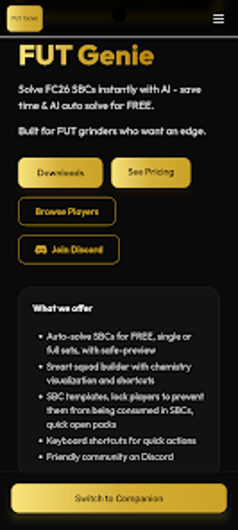 FUTGenie är en gratis mobilapplikation för Android som förbättrar upplevelsen av FIFA Ultimate Team (FUT). Den erbjuder funktioner som automatisk färdigställande av Squad Building Challenges (SBCs) och möjligheten att snabbt öppna paket. Användare kan också se vinster på överföringar, vilket gör det lättare att hålla koll på sin ekonomi i spelet. Med ett användarvänligt gränssnitt gör FUTGenie det enkelt för spelare att navigera och använda verktygen.